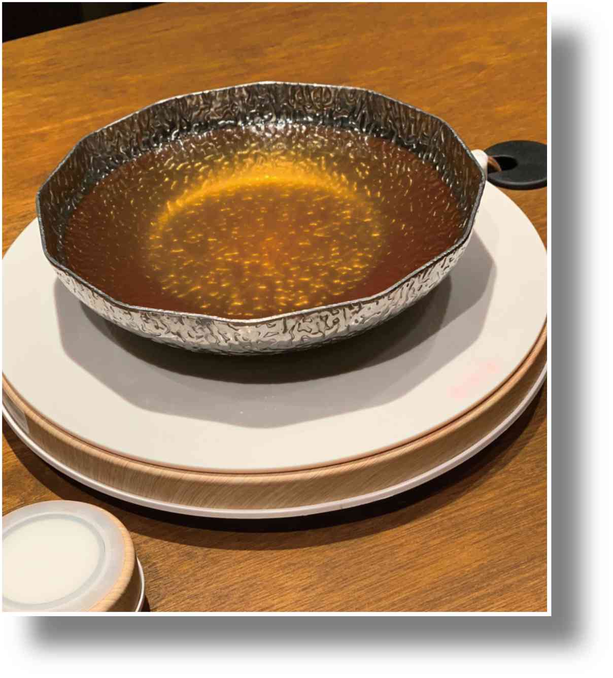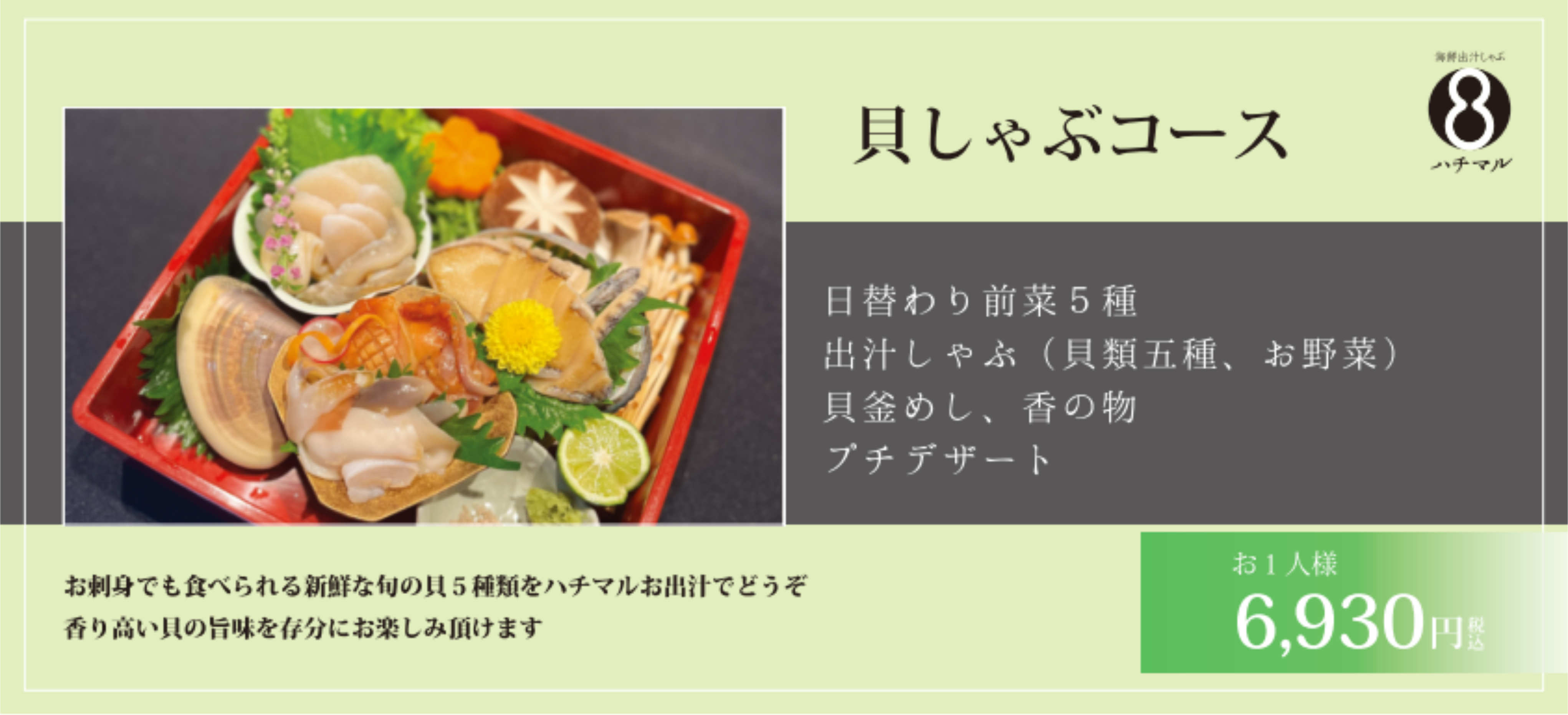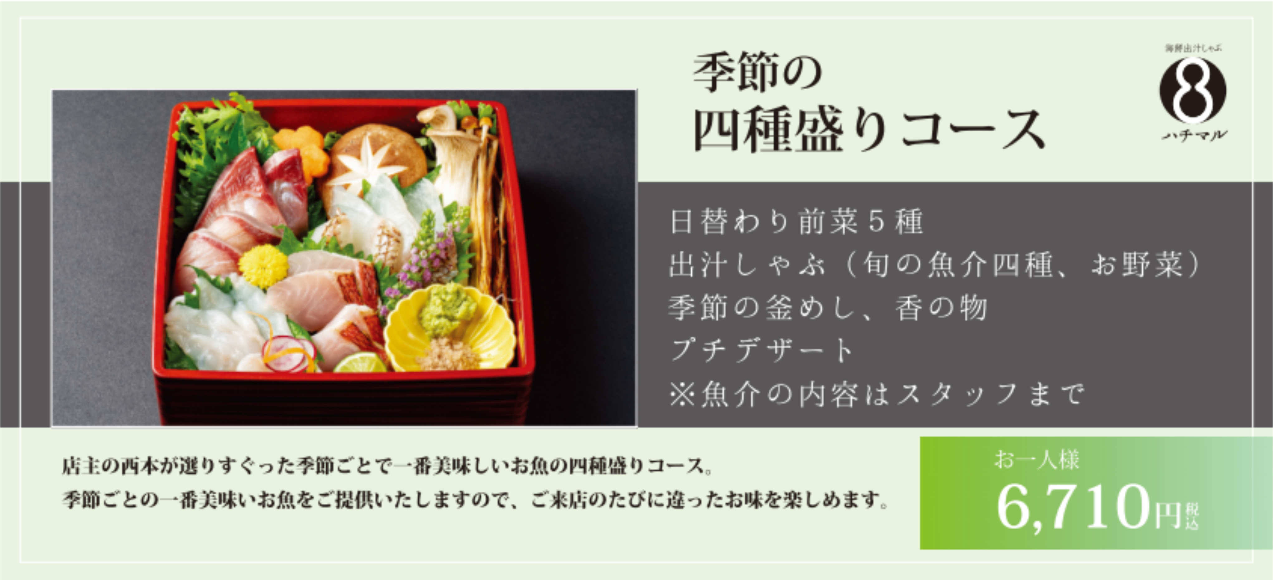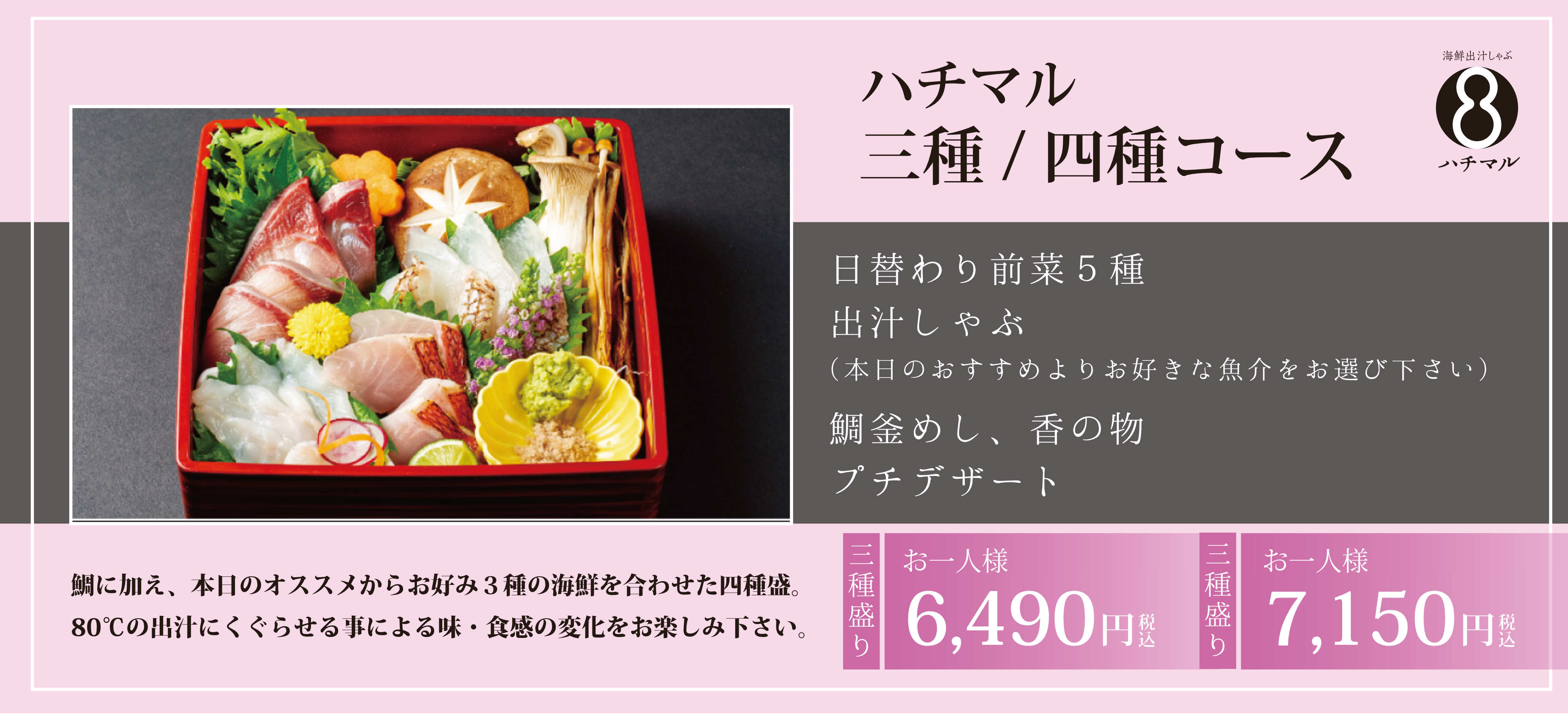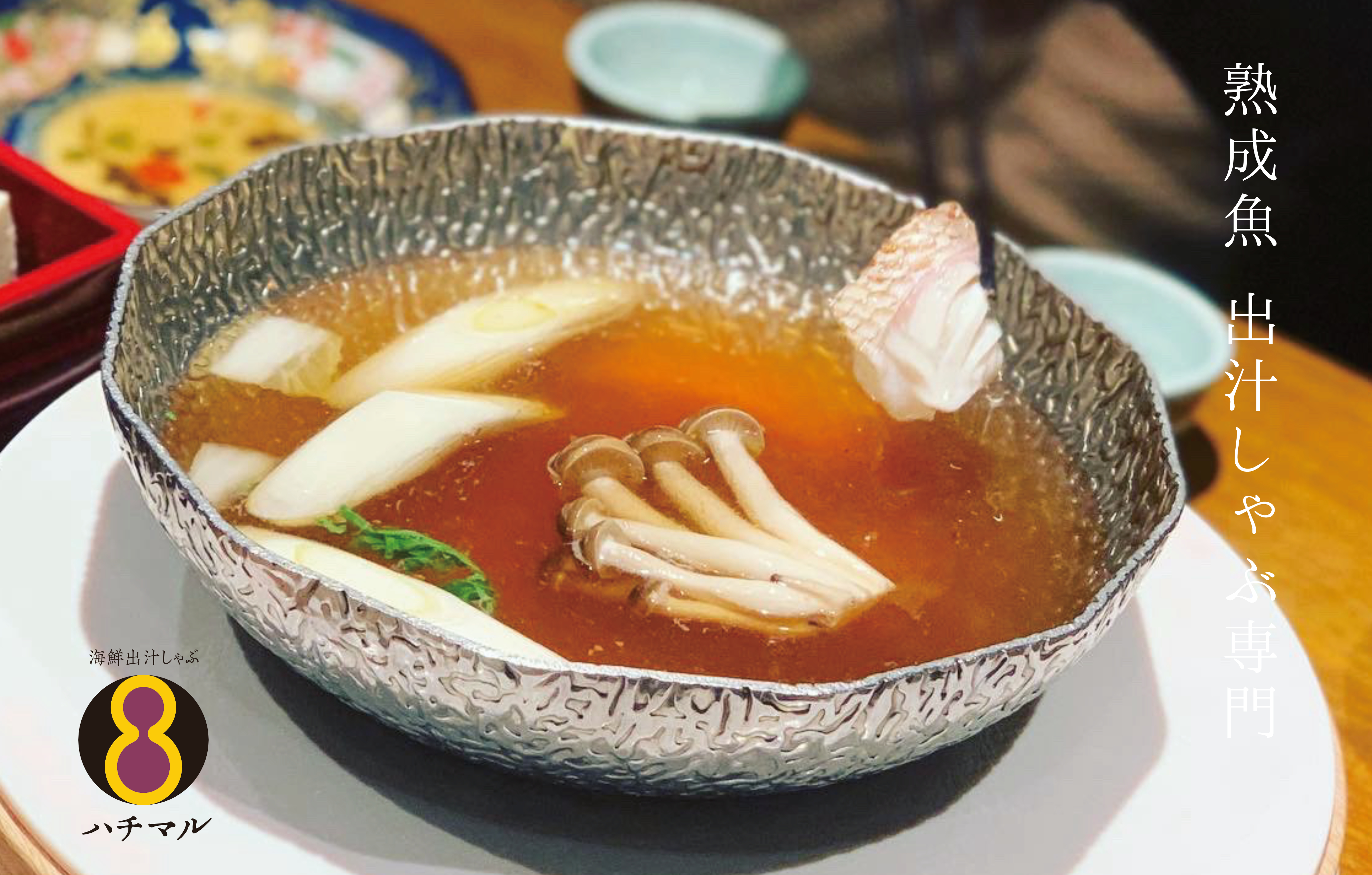 鰹と昆布の一番だしにハチマル自慢の熟成魚をさっと潜らせ、切り身の表面1mmに火が通る極レアで召し上って頂くのがハチマル流。