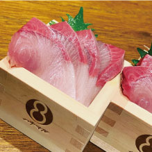新鮮な状態で全国から届いた魚を、ハチマルの料理長「西本基康」が魚に合わせた適切な技法とタイミングで、旨味のイノシン酸を最高潮まで熟成した状態でご提供いたします。