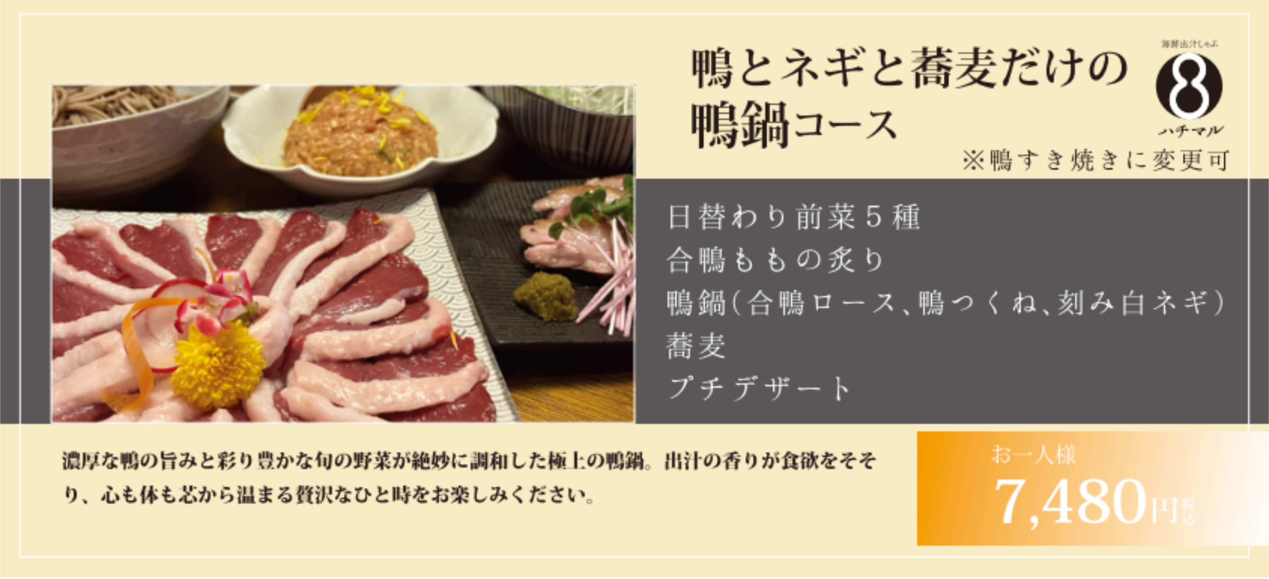 ハチマルの名前の由来でもある80度のお出汁で召し上がって頂きます。